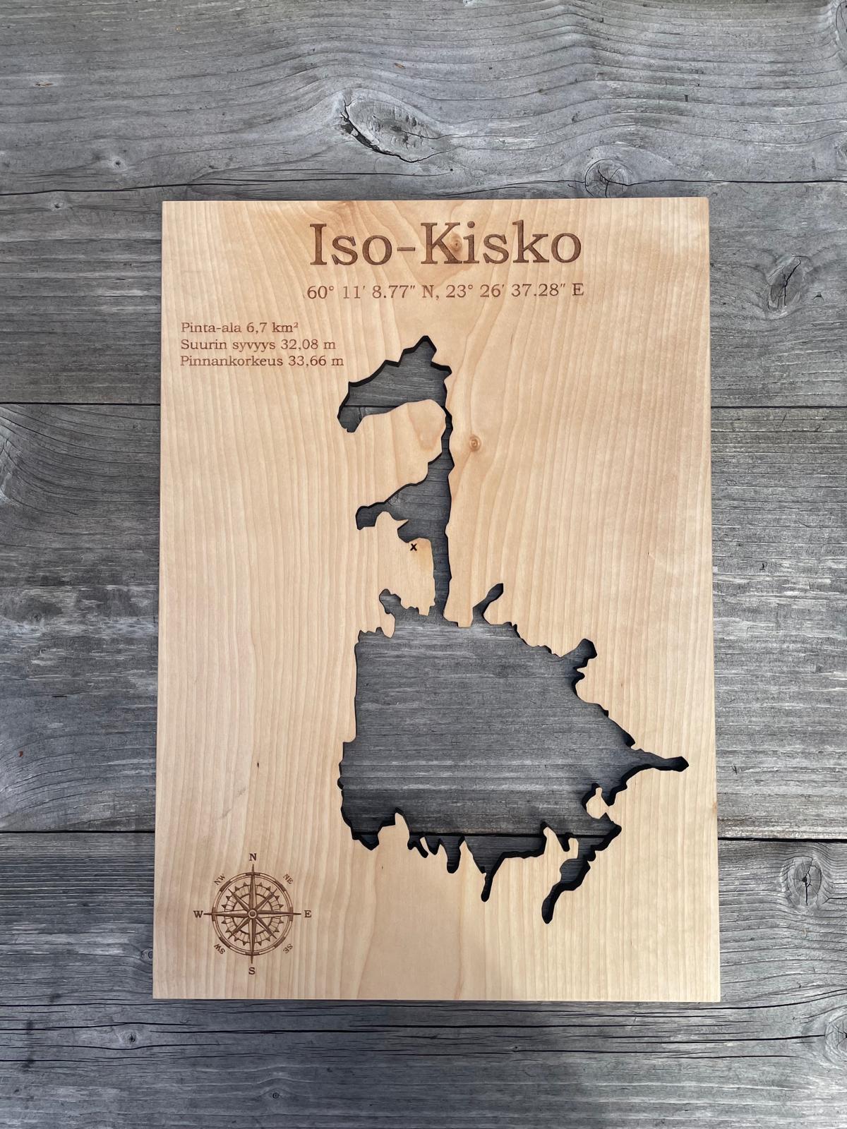 Massiivipuusta valmistettu sisustustaulu. Tauluun voidaan ikuistaa oma lempijärvi. Lisää ostoskorin tekstikenttään tekstiä varten järven nimi sekä halutut koordinaatit. Tilaukseen voidaan lisätä myös halutessasi muutakin tekstiä, esimerkiksi järven pinta-ala ja suurin syvyys. Otathan huomioon, että puun syykuviot ja väri saattavat olla erilaiset kuin mallikuvien tauluissa. Taulujen toimitusaika 2-4 viikkoa.