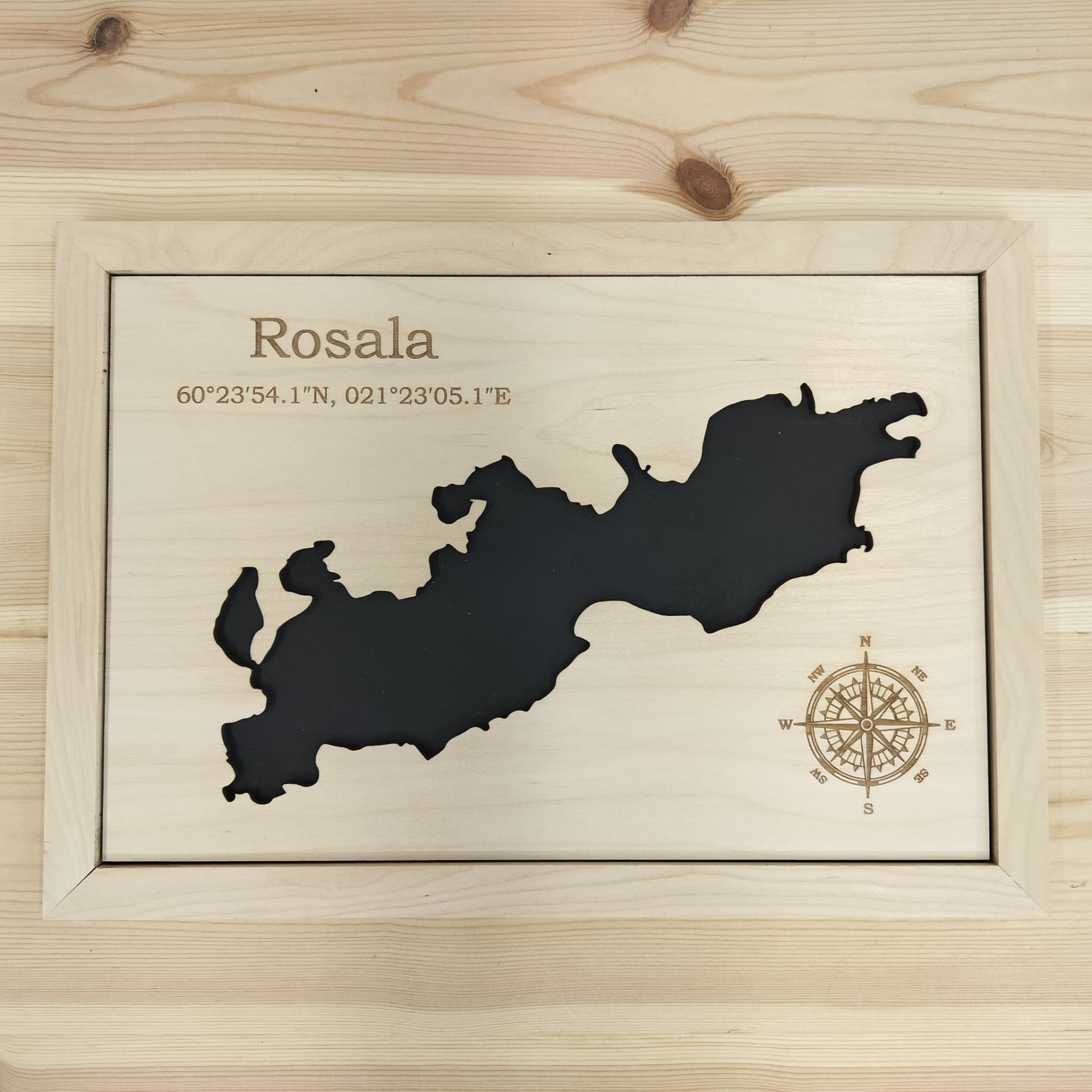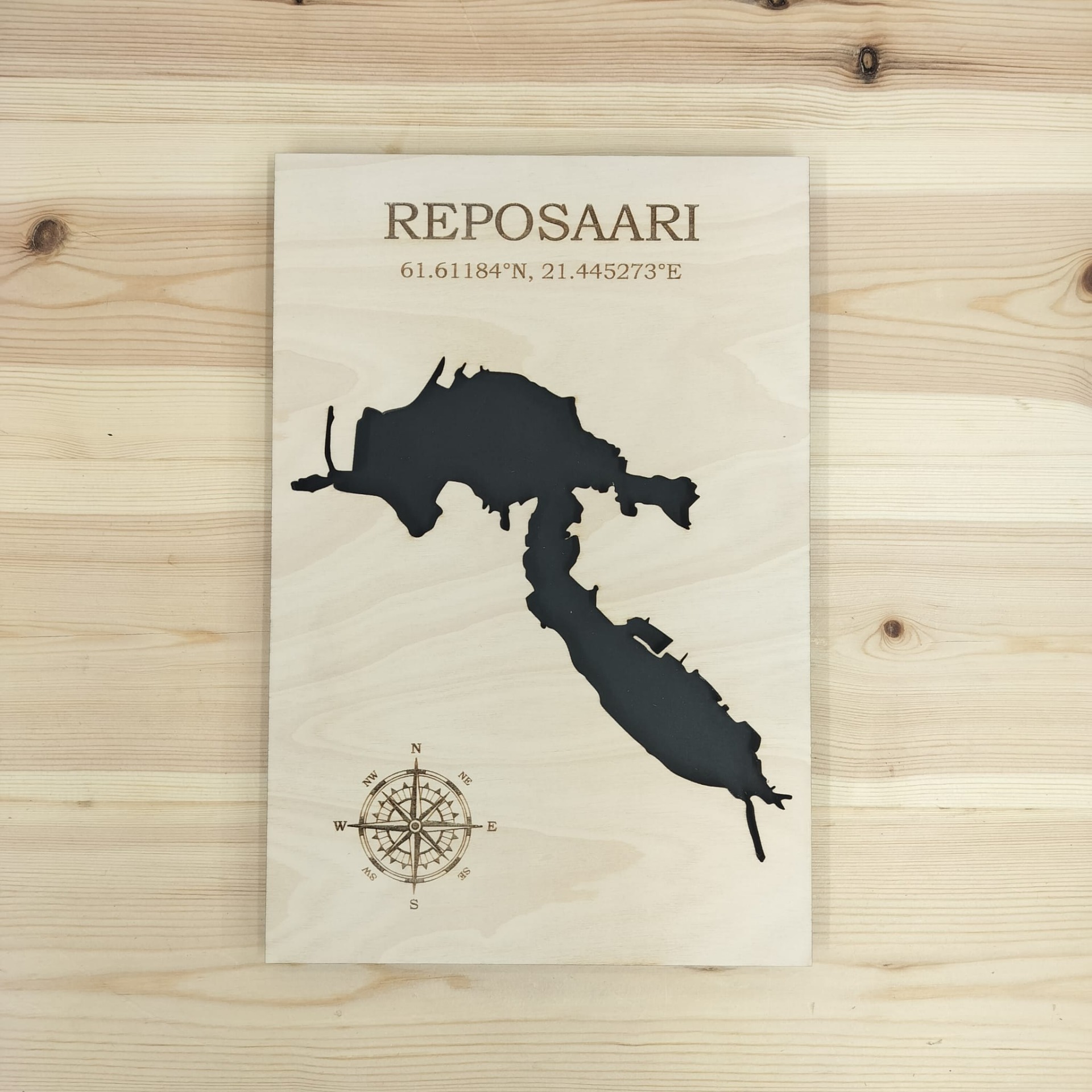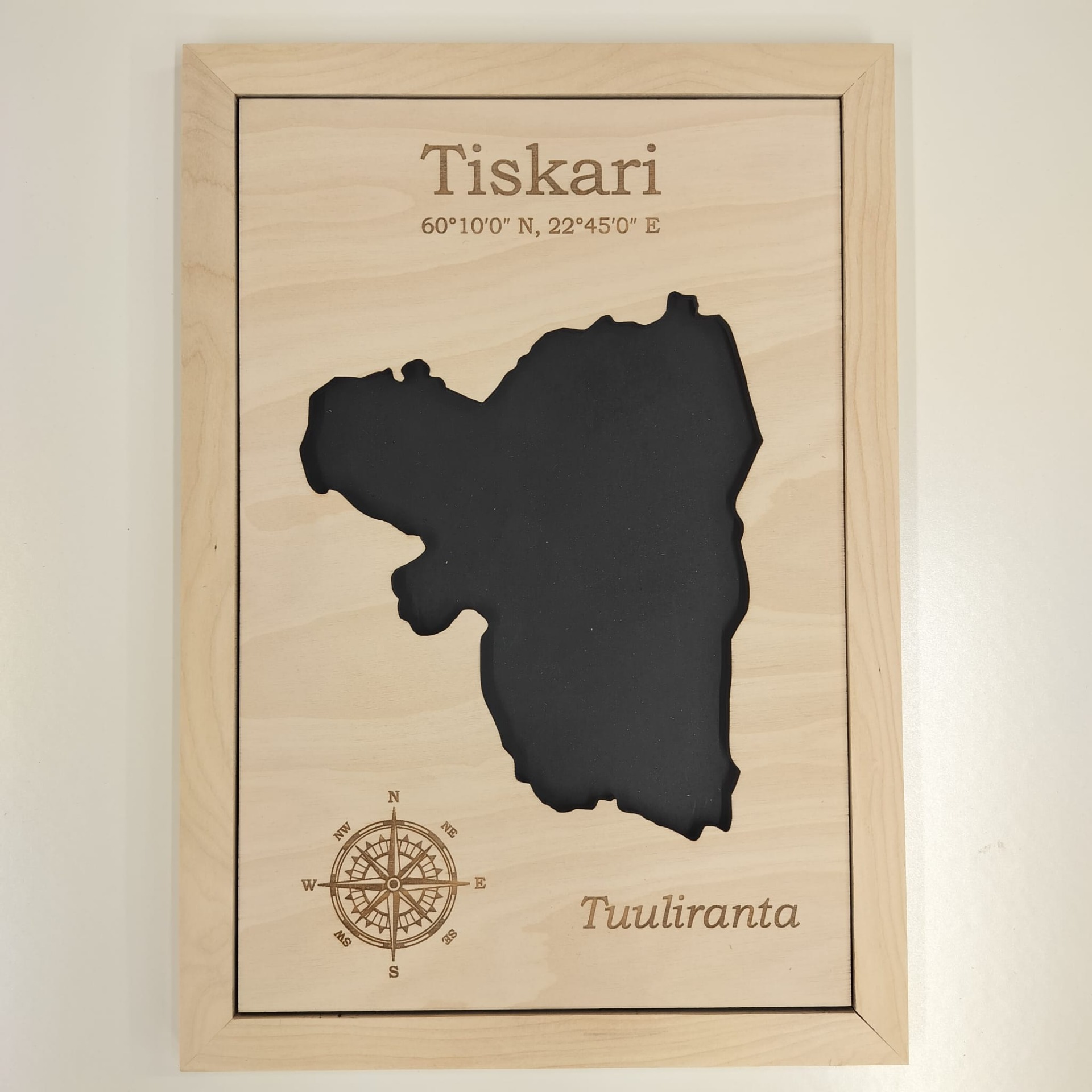 Vanerista sekä kovalevystä valmistettu sisustustaulu läpi poltetulla kuvalla. Taulun taustana on joko valkoinen tai musta kovalevy. Tauluun voidaan ikuistaa esimerkiksi oma lempisaari tai kotijärvi. Lisää ostoskorin tekstikenttään saaren tai järven nimi sekä halutut koordinaatit. Teksti kaiverretaan tauluun.