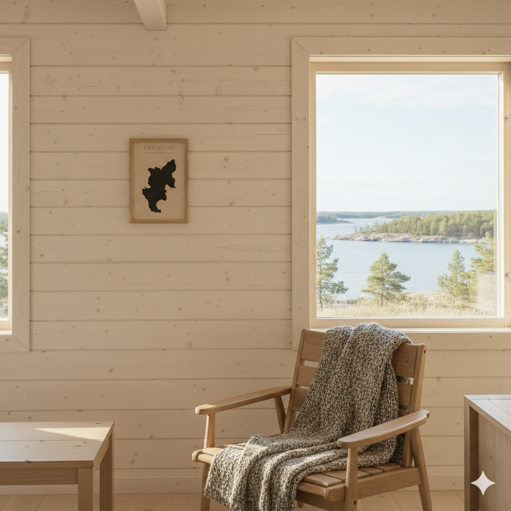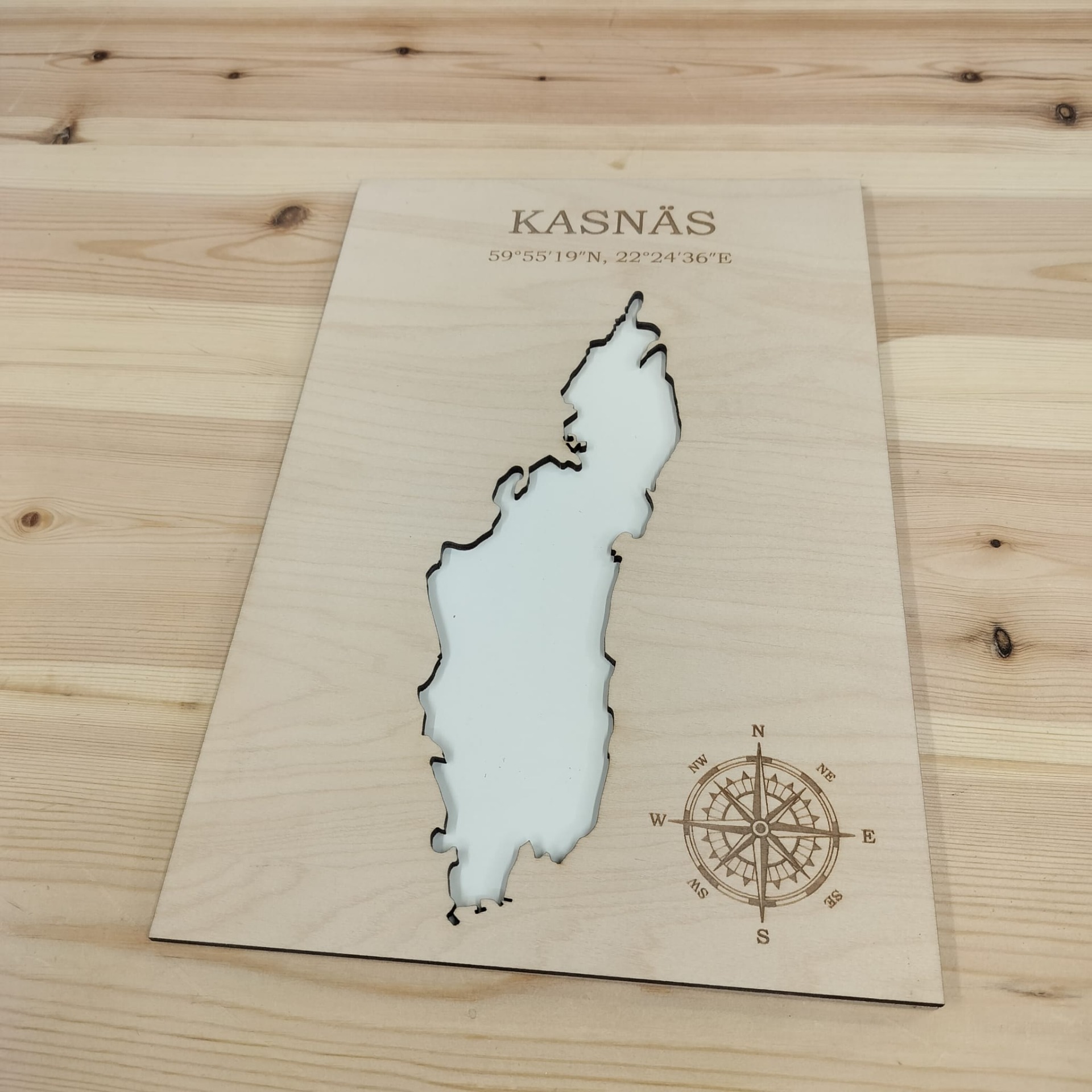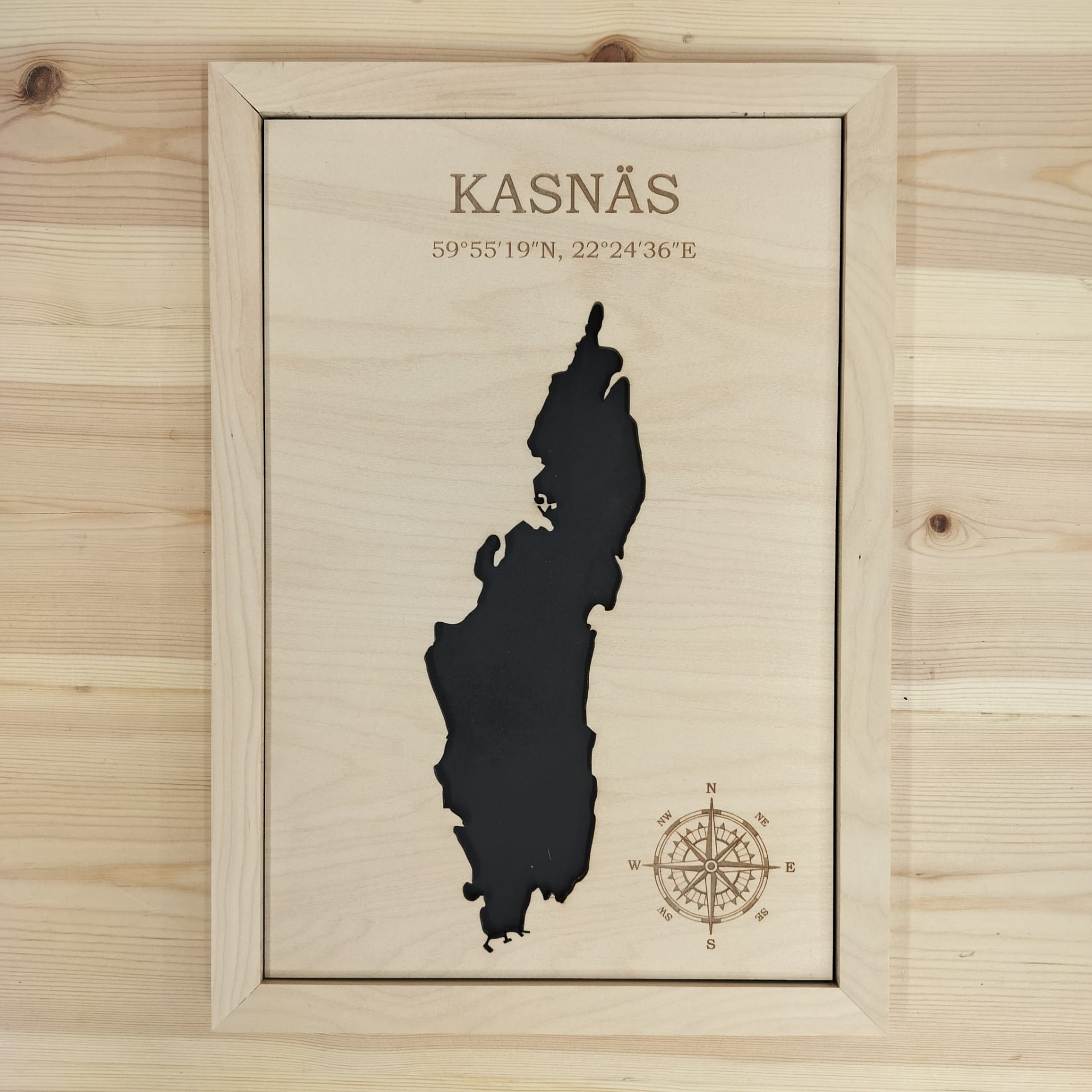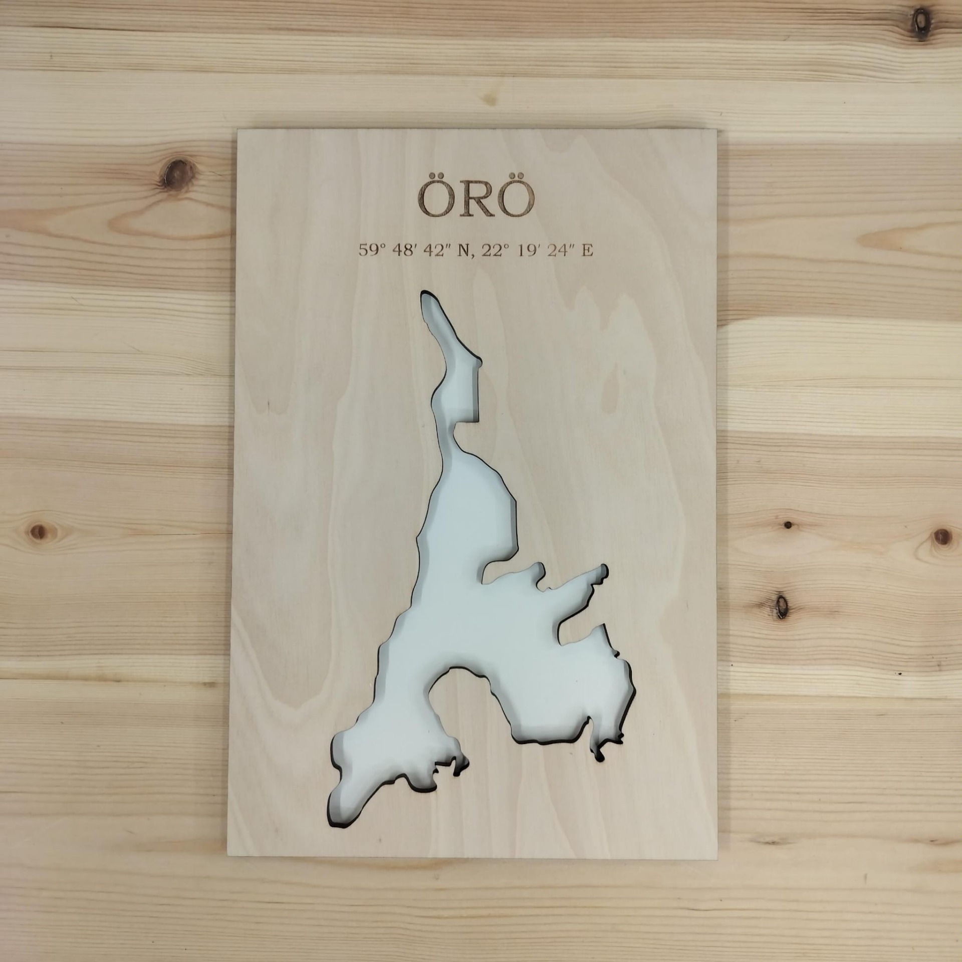 Vanerista sekä kovalevystä valmistettu sisustustaulu läpi poltetulla kuvalla. Taulun taustana on joko valkoinen tai musta kovalevy. Tauluun voidaan ikuistaa esimerkiksi oma lempisaari tai kotijärvi. Lisää ostoskorin tekstikenttään saaren tai järven nimi sekä halutut koordinaatit. Teksti kaiverretaan tauluun.