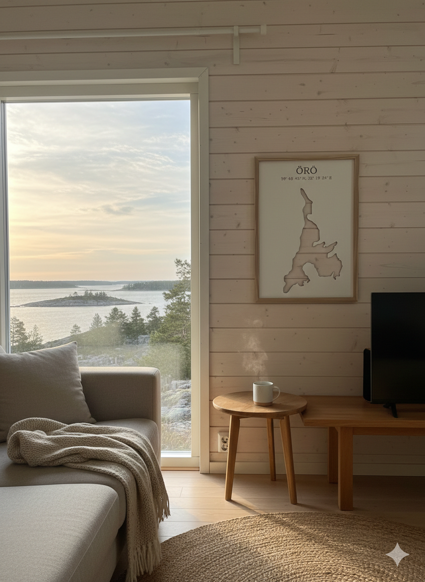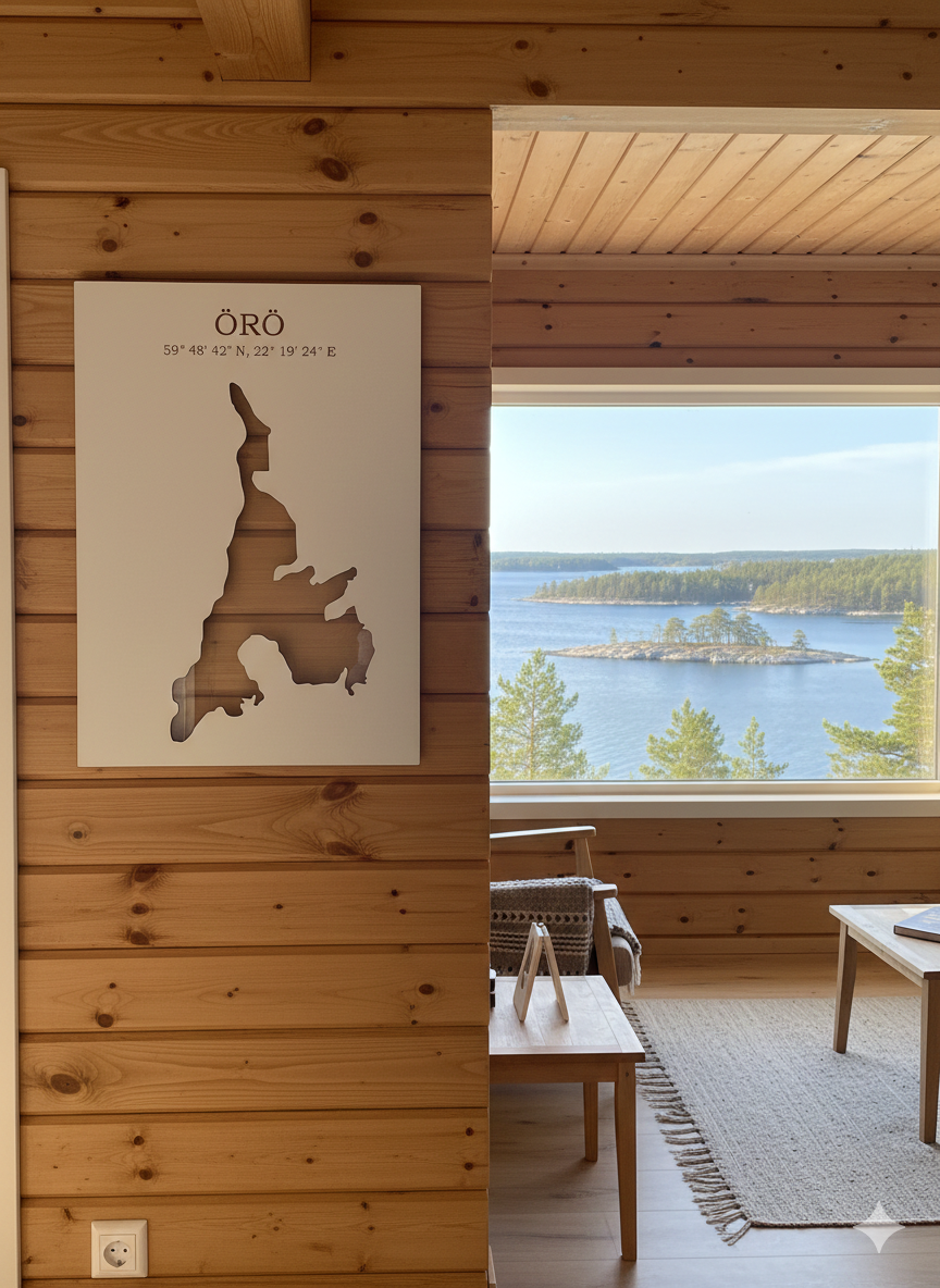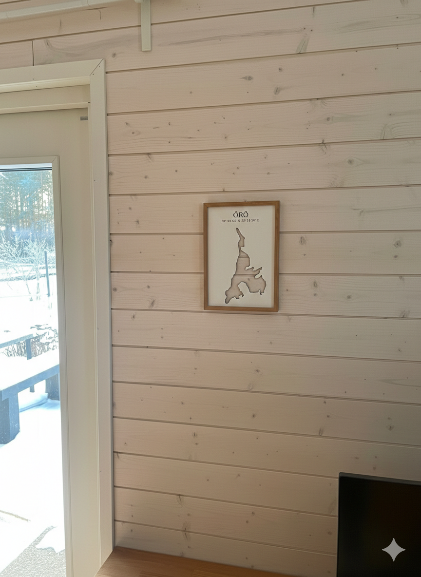 Kovalevystä valmistettu sisustustaulu läpileikatulla kuvalla. Tauluun voidaan ikuistaa esimerkiksi oma lempisaari tai kotijärvi. Lisää ostoskorin tekstikenttään haluamasi saaren tai järven nimi sekä halutut koordinaatit. Teksti kaiverretaan tauluun.