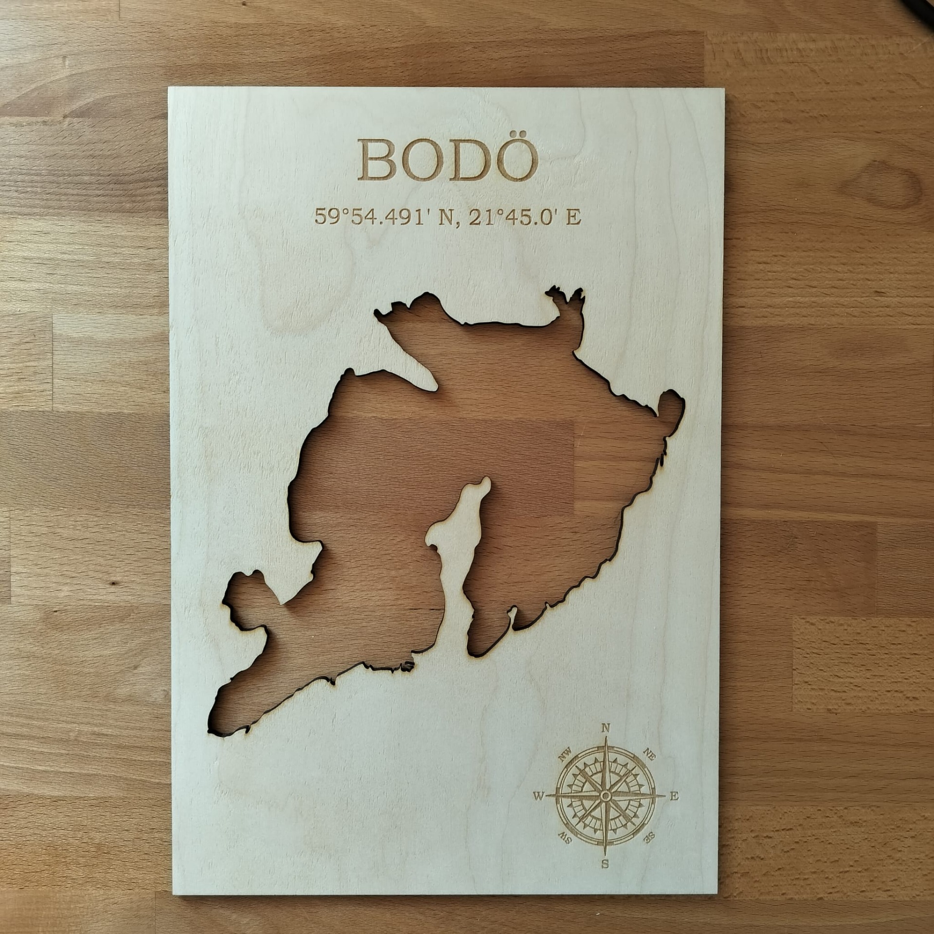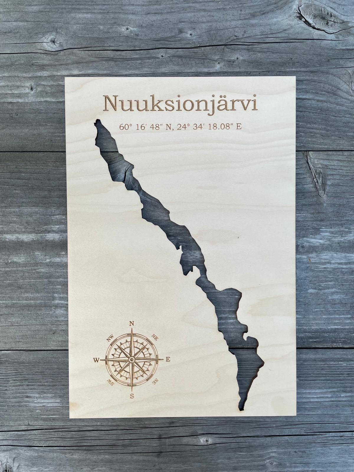 Vanerista valmistettu sisustustaulu läpi poltetulla kuvalla. Tauluun voidaan ikuistaa esimerkiksi oma lempisaari tai kotijärvi. Lisää ostoskorin tekstikenttään saaren tai järven nimi sekä halutut koordinaatit. Teksti kaiverretaan tauluun. Tauluja ei ole pintakäsitelty.